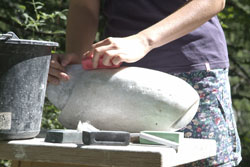 Das Material Speckstein ist ein ideales Material für die dreidimensionale Arbeit. Es lässt sich leicht mit der Raspel, Hammer oder Messer bearbeiten. Ich verwende es gerne für intuitive Arbeiten und freie Formen.